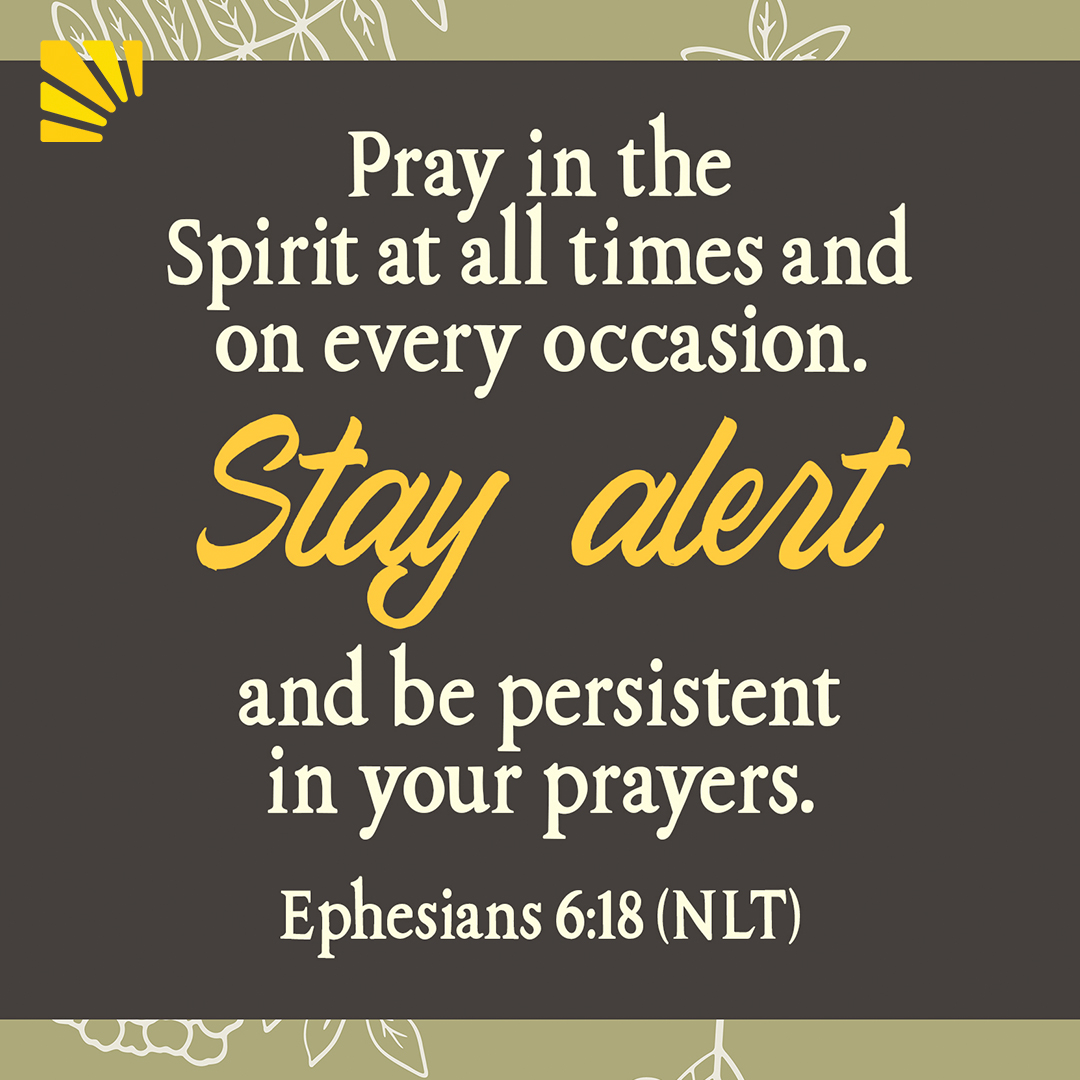 "Pray in the Spirit at all times and on every occasion. Stay alert and be persistent in your prayers." Ephesians 6:18 (NLT)