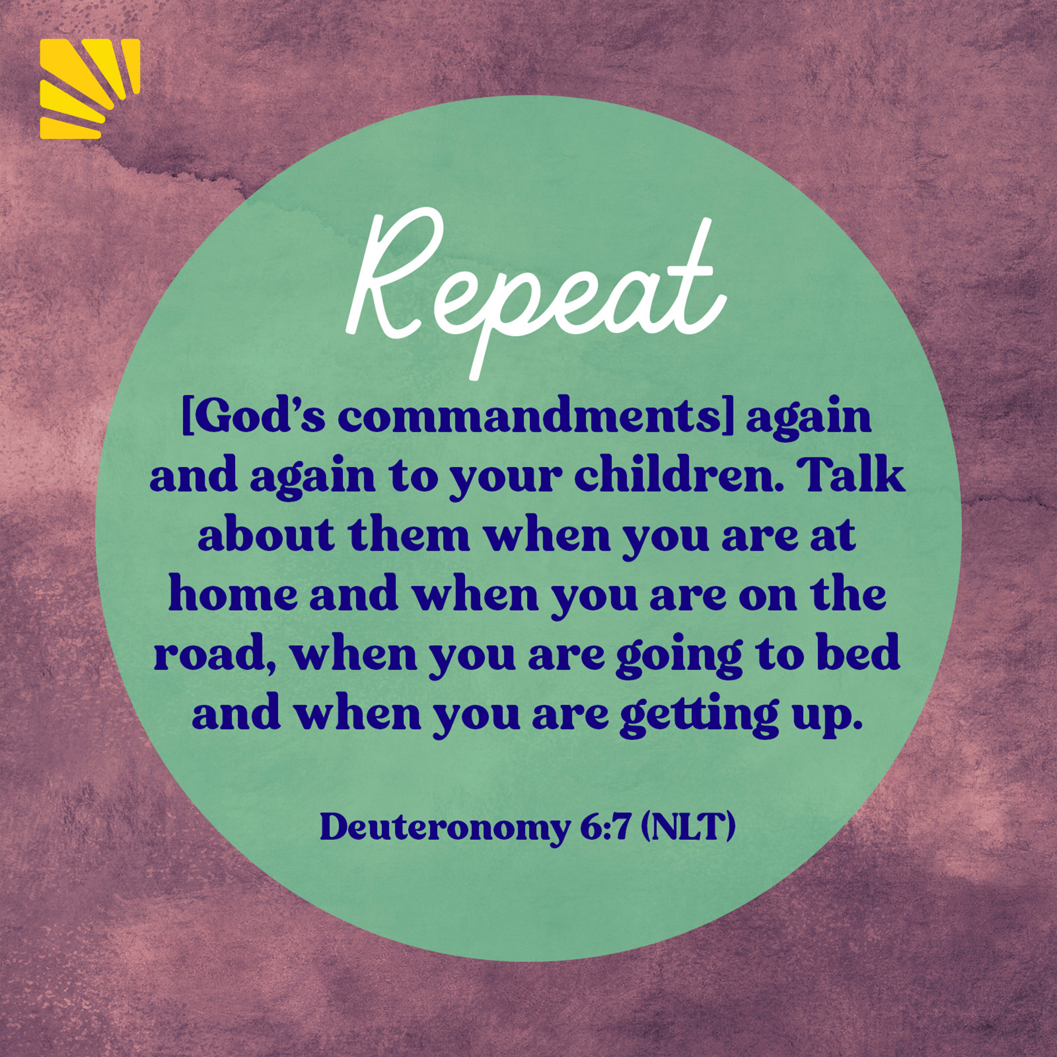Deuteronomy 6:7 says, “Repeat [God’s commandments] again and again to your children. Talk about them when you are at home and when you are on the road, when you are going to bed and when you are getting up” (NLT).
