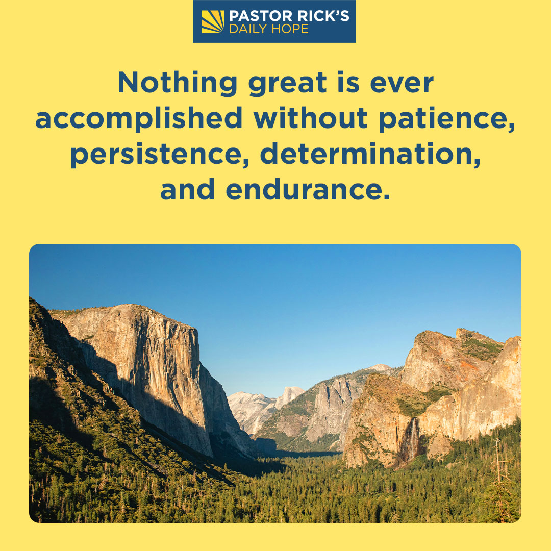 Nothing great is ever accomplished without patience, persistence, determination, and endurance. I suggest that you set big goals and spend the rest of your life going after them.