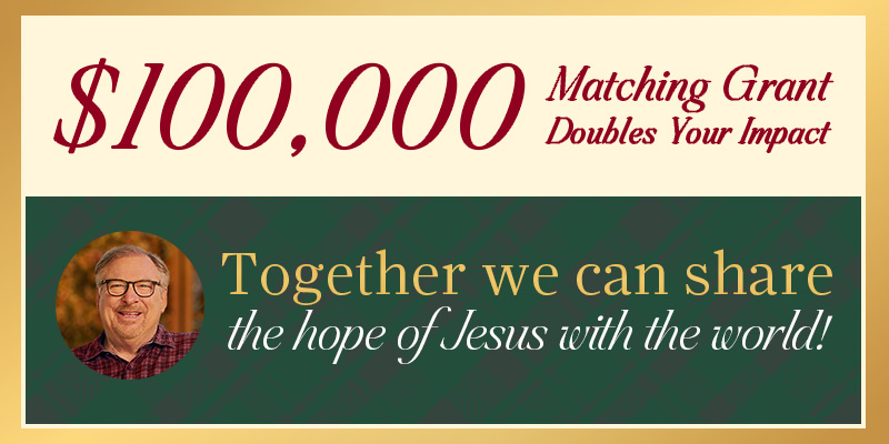 We’re so grateful for your partnership to share the Good News! Your gift today comes at a great time, because it will be doubled by a $100,000 Matching Grant to reach more people who don't yet know they can have their past forgiven, a purpose for living, and a home in heaven.